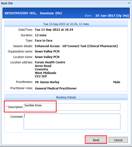 Enter a Description for the booking and, if required, a Comment. Click on Book:
