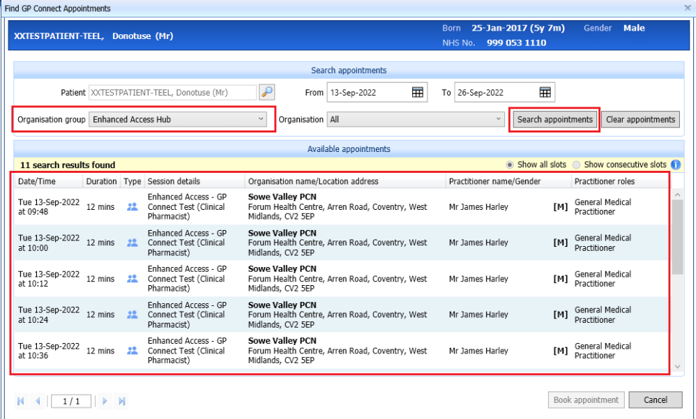 Select the correct Organisation group and click on Search appointments. A List of GP Connect Bookable Appointments in the hub will appear. Select an appropriate slot and click on Book appointment: